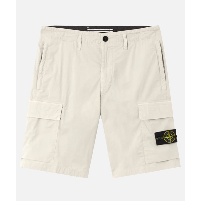 Bermuda shorts in lightweight stretch cotton canvas with zip pockets, a back pocket and snap button pockets on the legs. Garment dyed.