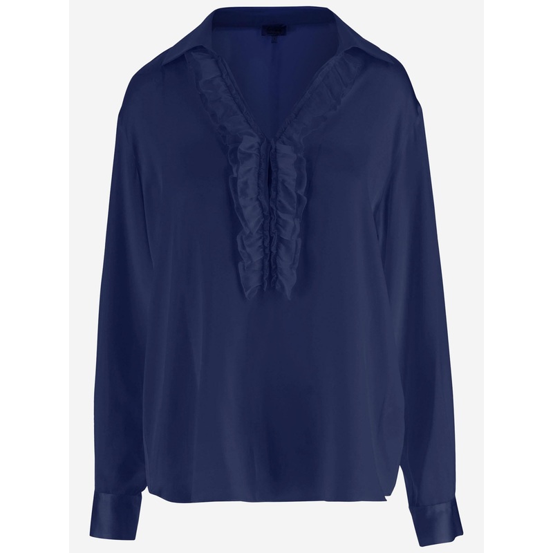 This elegant Stretch Silk Blouse with Ruffles from Her Shirt is a perfect blend of sophistication and comfort. Crafted from a luxurious silk blend, it features delicate ruffles that add a feminine touch to your outfit.The model is wearing size S, showcasin
