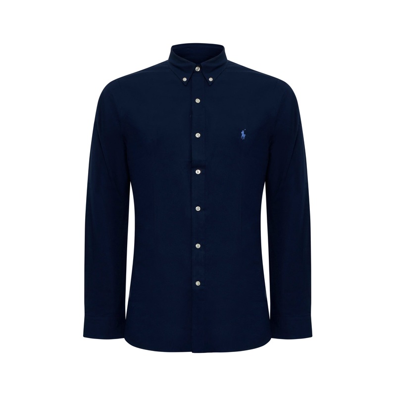 Stretch cotton shirt Blue and white stripes Pointed button-down collar Front button fastening and buttoned cuffs Embroidered logo on the chest Rounded hem Made in ExtraEU