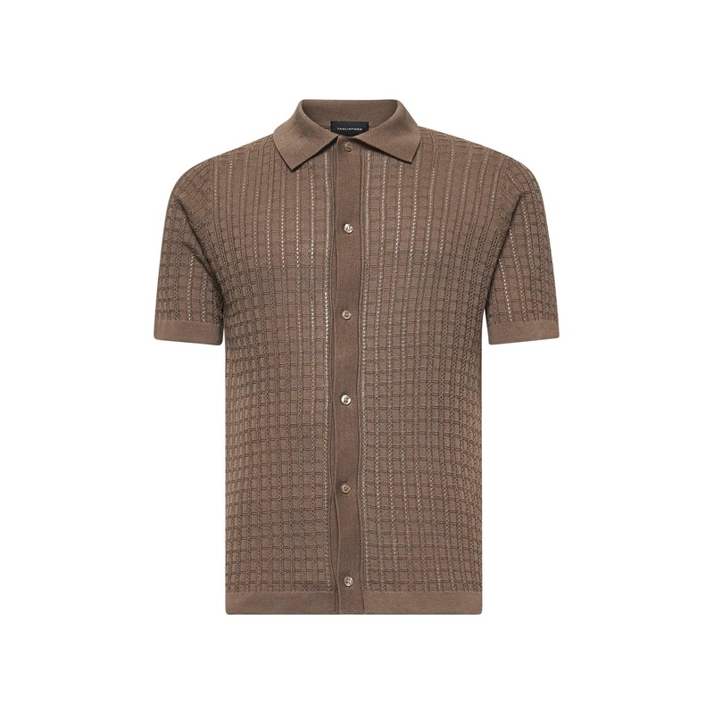 Front button placketClassic ribbed collarShort sleevesRibbed cuffs and bottom bandCheck-style pattern cotton knit design with openwork detailingRegular fitTaupe color100% CottonMade in Italy