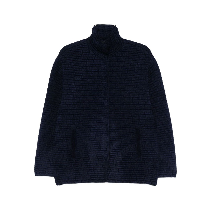 Elevate your everyday wardrobe with this sophisticated textured high-neck zip sweater from Emporio Armani. Crafted in a rich navy blue hue, this piece features an alluring textured finish that adds depth and visual interest to your look. The high turtlenec
