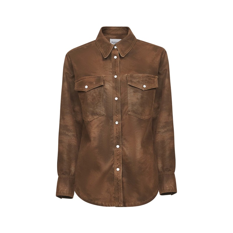 Front snap button placket Shirt collar Long sleeves, snap-buttoned cuffs Patch pockets at chest with snap-buttoned flap Back yoke with box pleats Rounded hem Vintage-effect finish faux leather design Straight fit Tobacco color 63% Polyurethane, 28% Viscose
