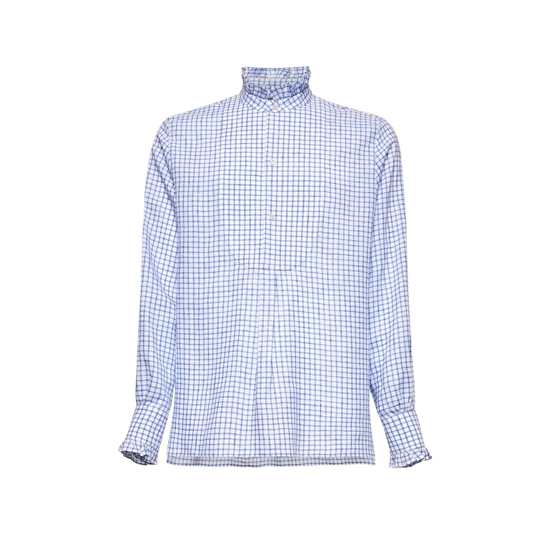Partial front button placketStanding ruffled collarLong sleeves, buttoned ruffled cuffsFront plastron; pleat detail at frontBack yoke with gathered detailingSide slits at bottomDropped back hemRegular fitColor: white/blue100% LinenMade in Italy
