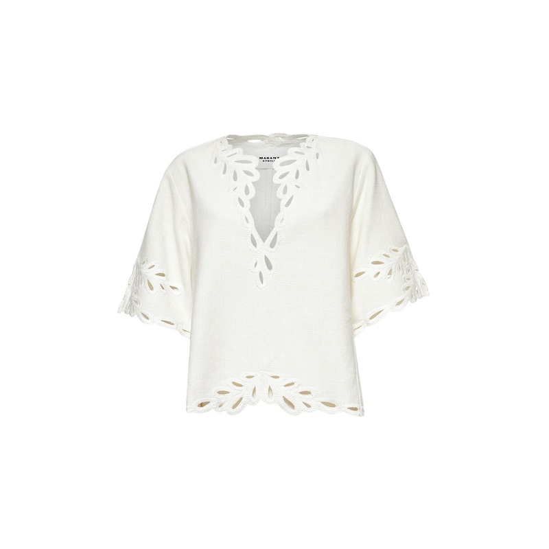 V-necklineWide short sleevesOpenwork embroidery at collar, sleeves, and hemShort lengthLoose fitWhite color100% CottonMade in Extra EU