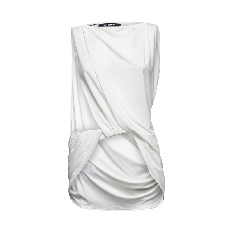 Square necklineSleeveless; wide asymmetric armholesElasticated waist with twisted drapeAsymmetric lengthFluid jersey designStraight fitWhite color82% Viscose, 18% PolyamideMade in Portugal