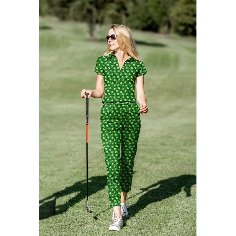 Women’s Golf Polo+Pants Set Leaf clover Green zebra St. Patrick’s Day