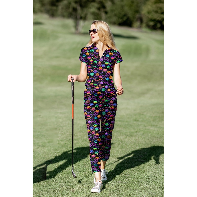 Women’s Golf Polo+Pants Set Neon Halloween Pumpkin