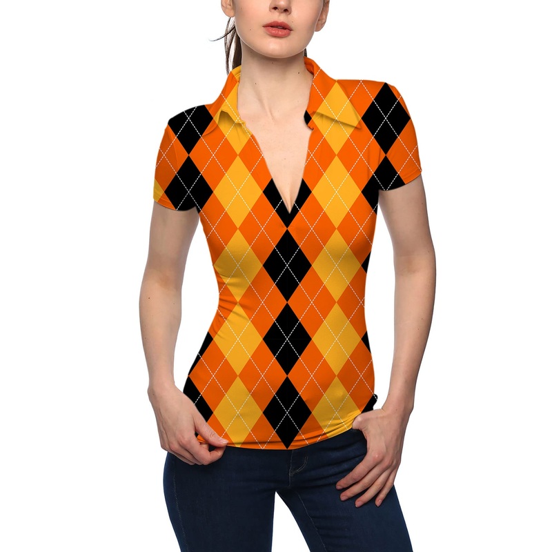 Women’s Halloween Black Yellow Orange Argyle V Neck Golf Polo