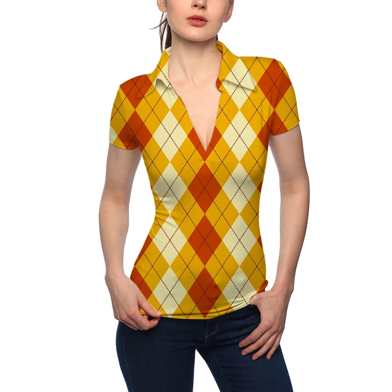 Women’s Halloween Light Yellow Red Argyle V Neck Golf Polo