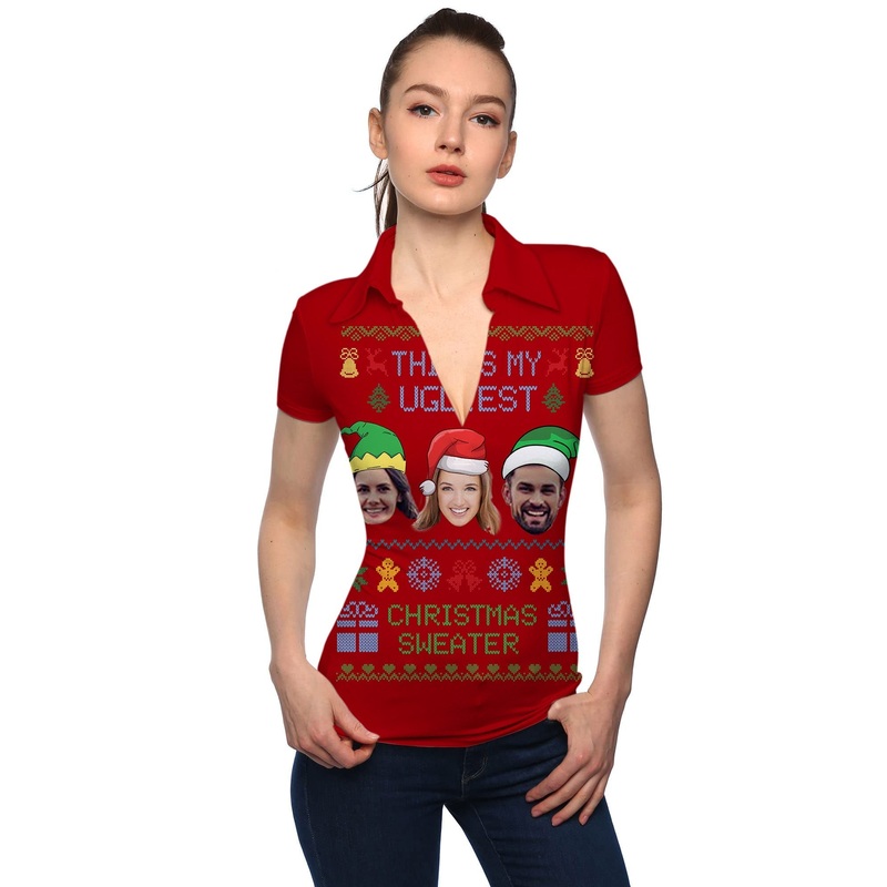 Women’s Red-Christmas Custom face V Neck Golf Polo
