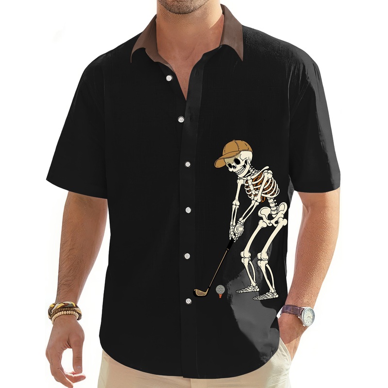 Yellow Black Brown Halloween Skeleton Golf Men’s Golf Hawaiian Shirts Button Down Shirt
