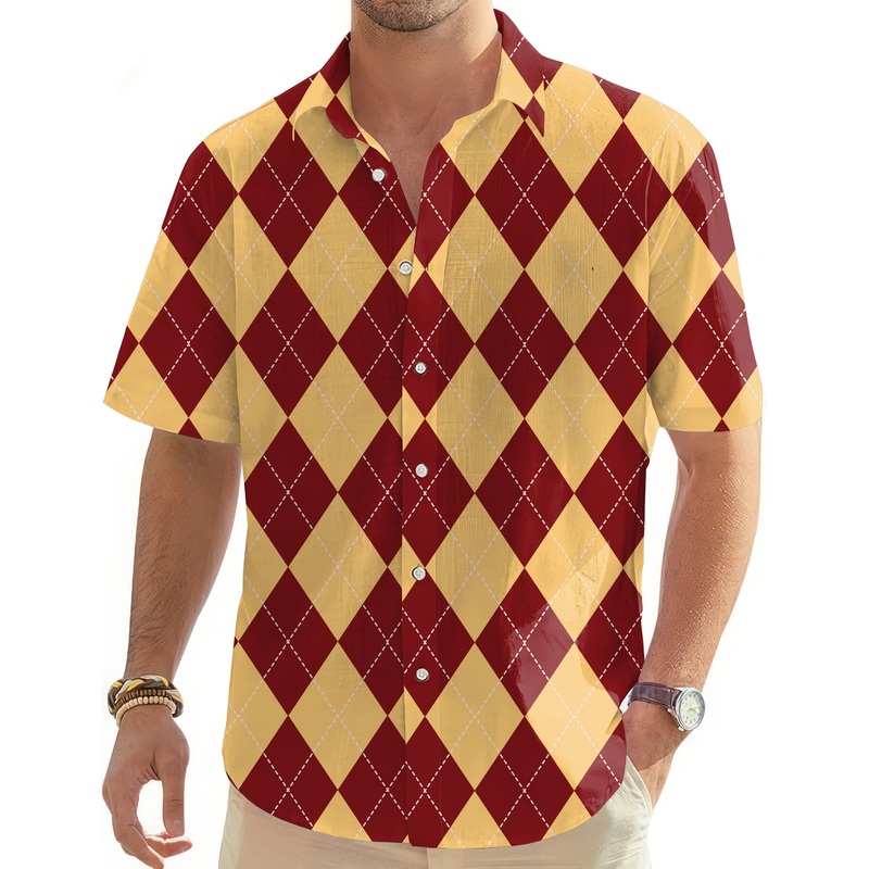 yellow red Argyle-Men’s Golf Hawaiian Shirts Button Down Shirt